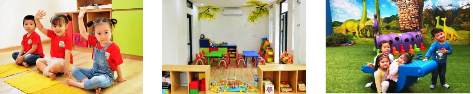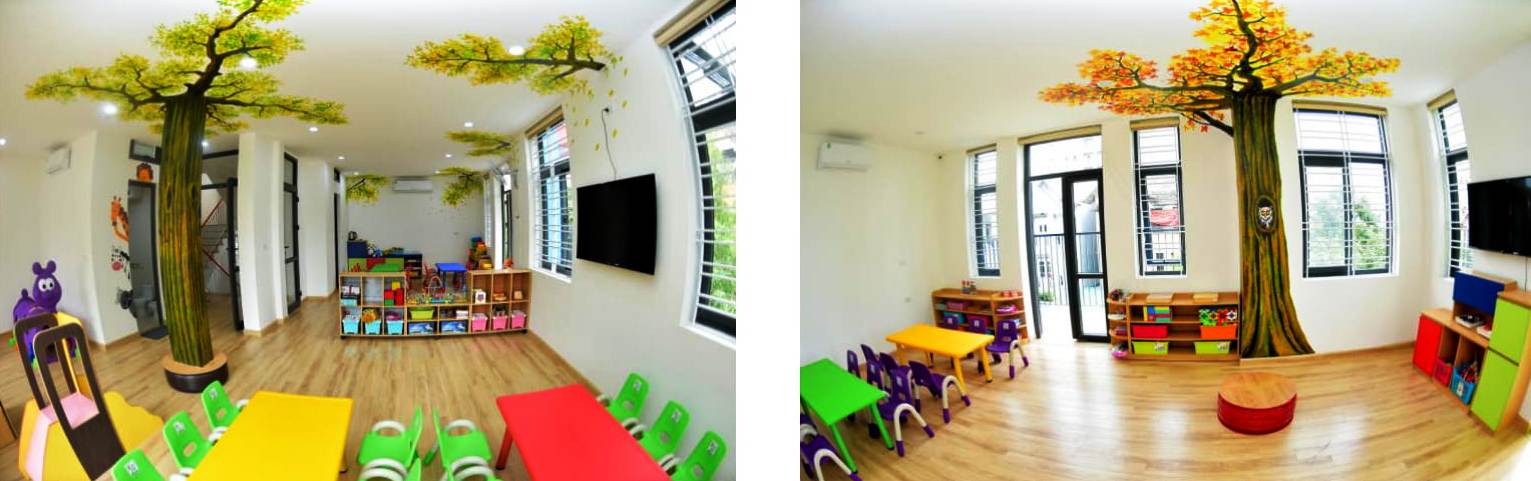 Không gian thiết kế mở với các phòng học thông nhau, có đủ các phòng chức năng, phòng học, khu vui chơi…tạo môi trường năng động thoải mái gần gũi, thân thiện. Hệ thống lớp học hiện đại, 100% các lớp được lát sàn gỗ, lắp điều hoà, nối mạng internet, lắp đặt đầy đủ các thiết bị chiếu sáng, quạt, đồng hồ. Các phòng học có nhiều cửa sổ nhìn ra không gian thoáng mát, trang bị đầy đủ bàn ghế, đồ dùng đồ chơi hiện đại đảm bảo cho trẻ học tập, vui chơi và sinh hoạt. Khu vệ sinh rất sạch sẽ, các trang thiết bị được bố trí vừa tầm trẻ và được phân chia theo giới tính.